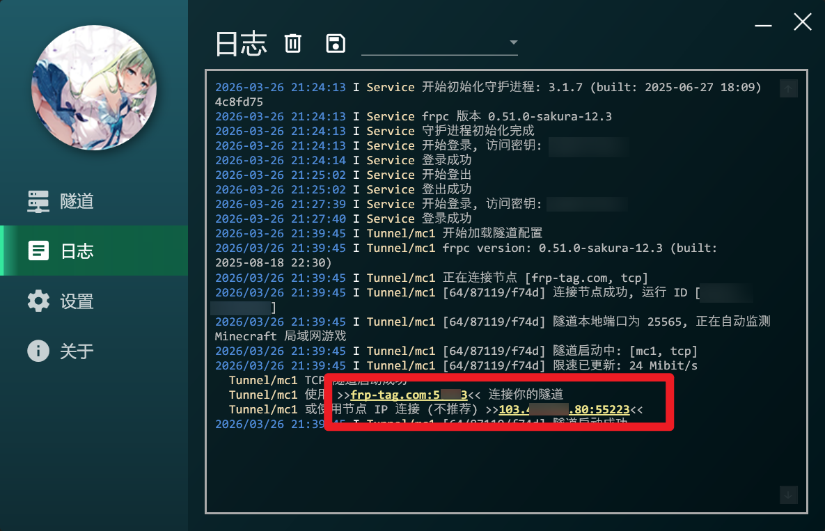 创建成功后,我们回到SakuraFrp的软件,开启你刚刚创建的那个隧道。